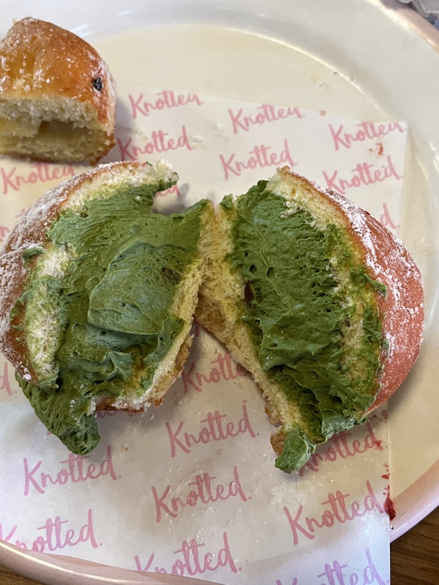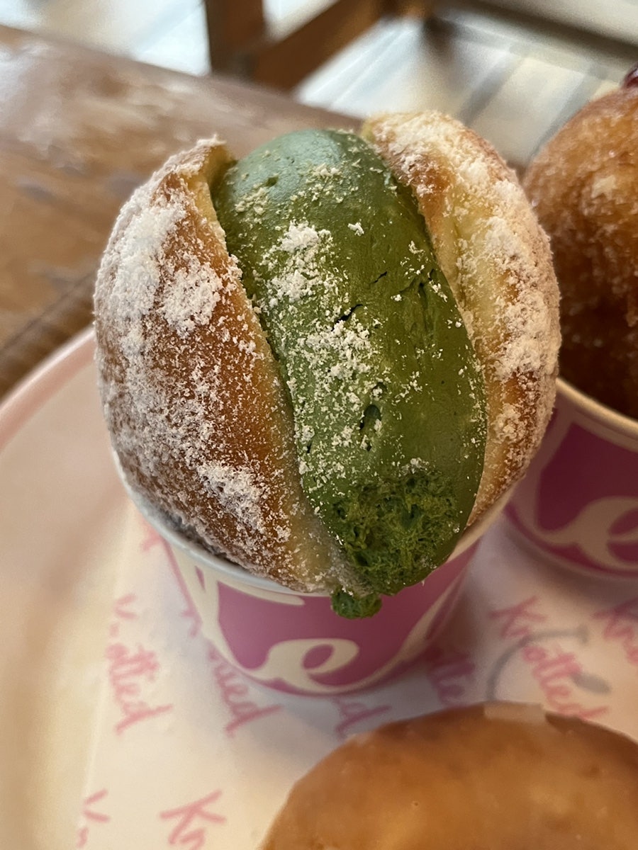 ふわふわのドーナツに、抹茶クリームがたっぷり!甘さ控えめで日本人好みの味。